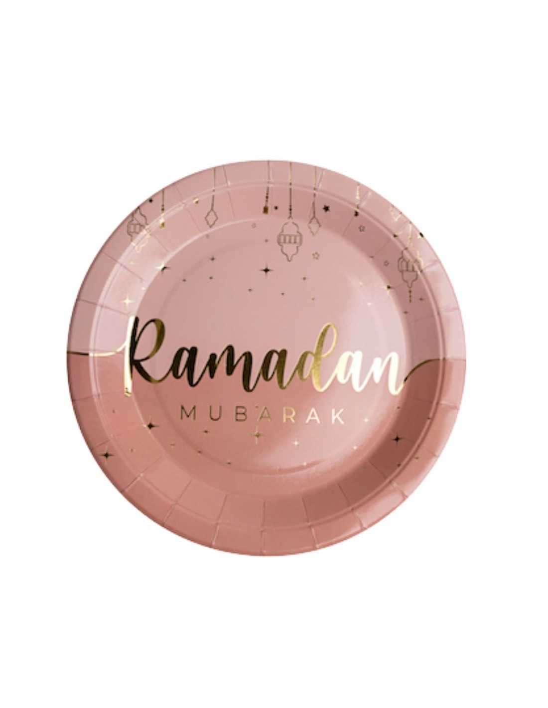 Jolies assiettes Ramadan Mubarak de couleur rose.